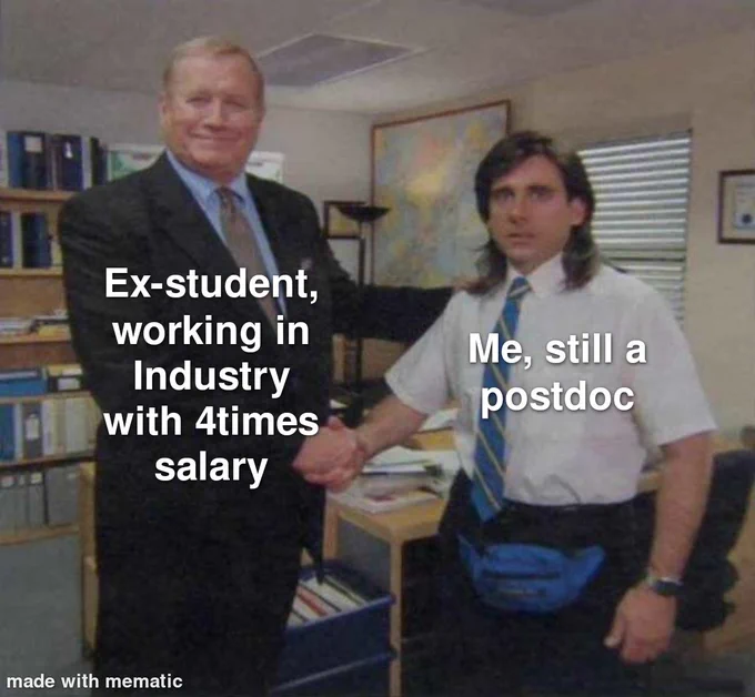 하지만 연구에 대한 순수한 마음과는 별개로 경제적으로 좋은 처우를 받기는 어려운 것이 현실이다. 일부 자금 사정이 괜찮은 교실들과 기업 연구소 등을 제외한다면, 보통 평균 임금 수준을 받게 되는 것 같다. 한국 전체 직장인들의 평균 임금이다. 2021년 12월 기준으로 평균 월 333만원을 받는다고 하니.. 분야마다 다르고 오차는 있겠지만 대략 맞다고 볼 수 있을 것 같다. 다른 박사졸업생들이 포닥이 아닌 다른 직종으로 일했을 때의 처우를 생각해 보면 결코 좋은 처우라고 말하기는 어려울 것 같다.